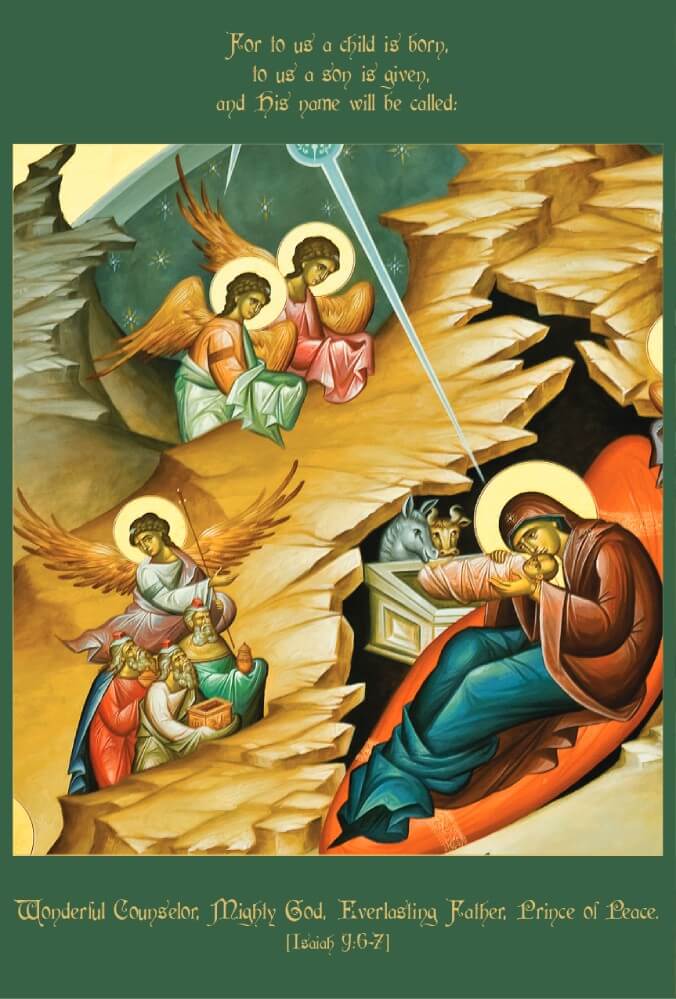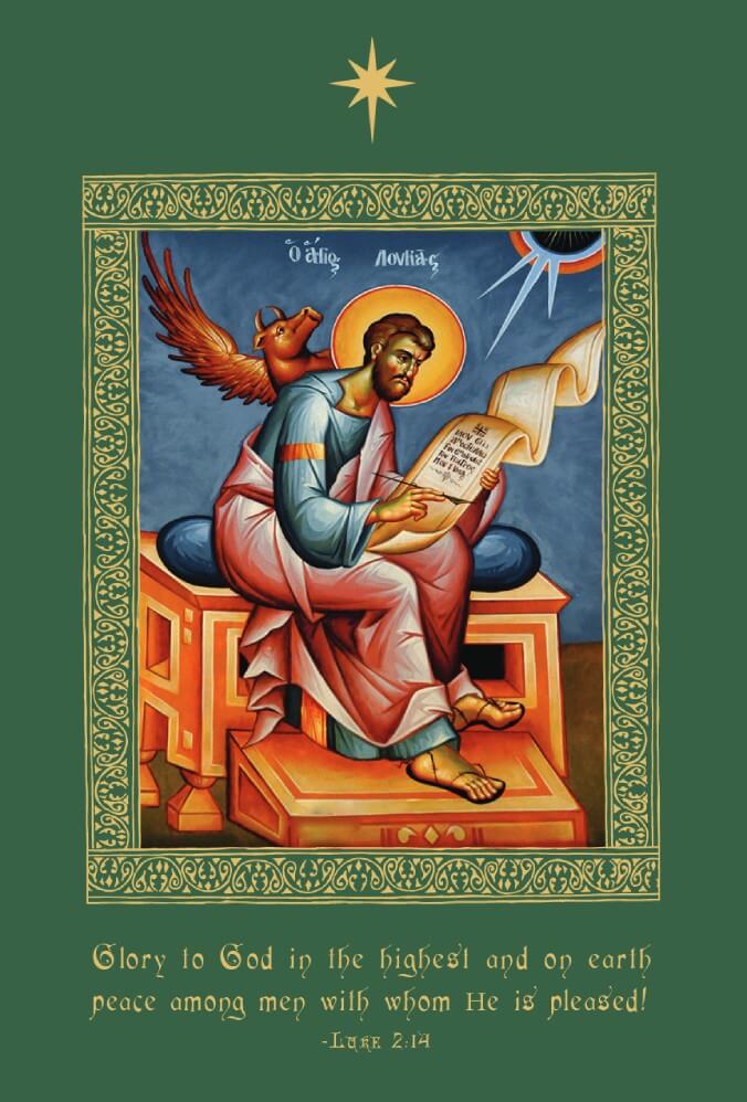 Each Community Christmas Card is 8 ½” x 17 ¼”, printed on high quality, 100 lb. White Linen paper stock, with scoring for two folds so that it can be placed upright like a triptych. There are four blank panels for the printing of names, with iconography on the front panel and inside center panel.